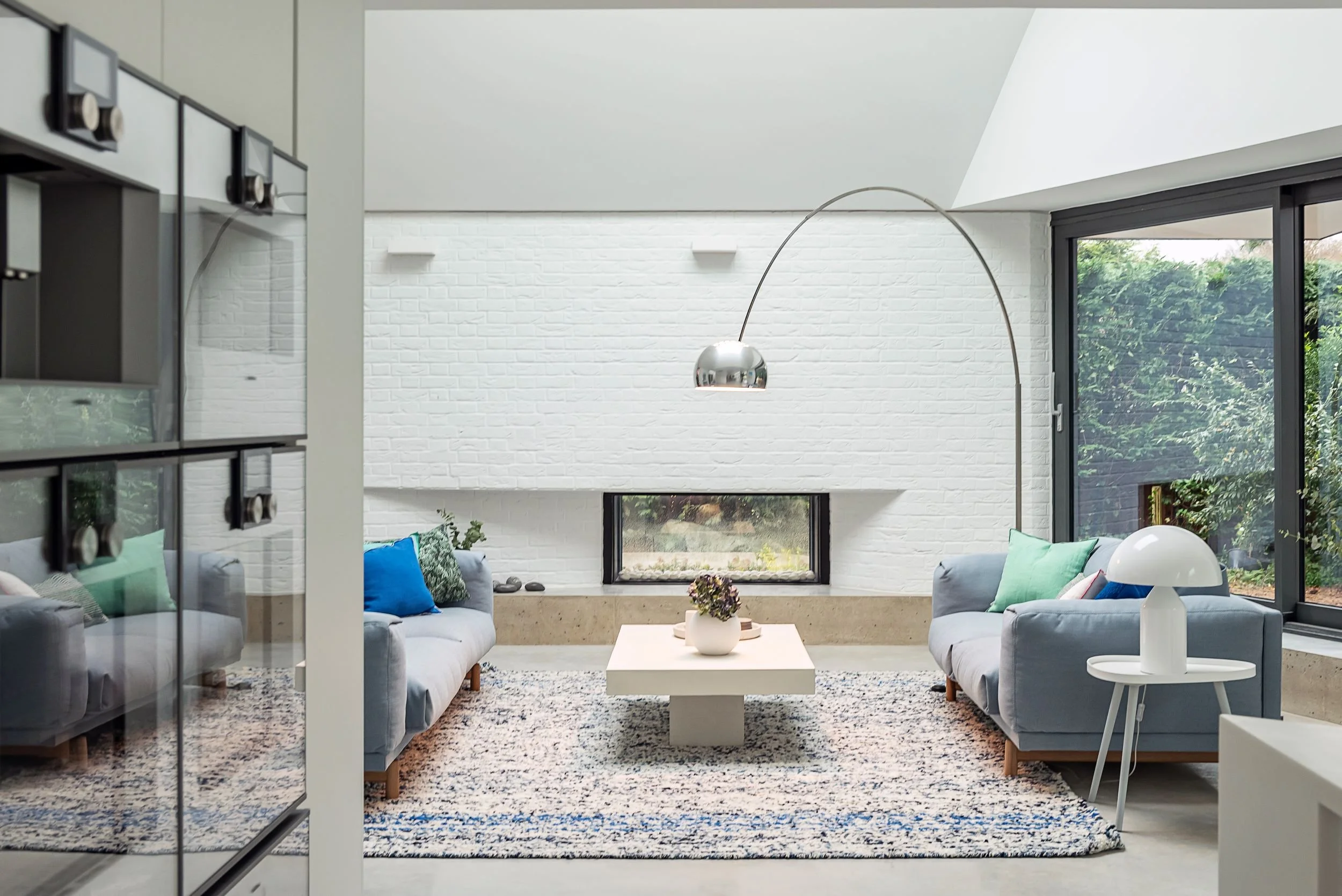 To retain the link between spaces, a beautiful polished concrete floor creates a cohesive visual flow, with a consistent white painted brick wall. The kitchen was purposely designed to blend with the white walls, with white cabinetry, a white island and a subtle white stone work surface.