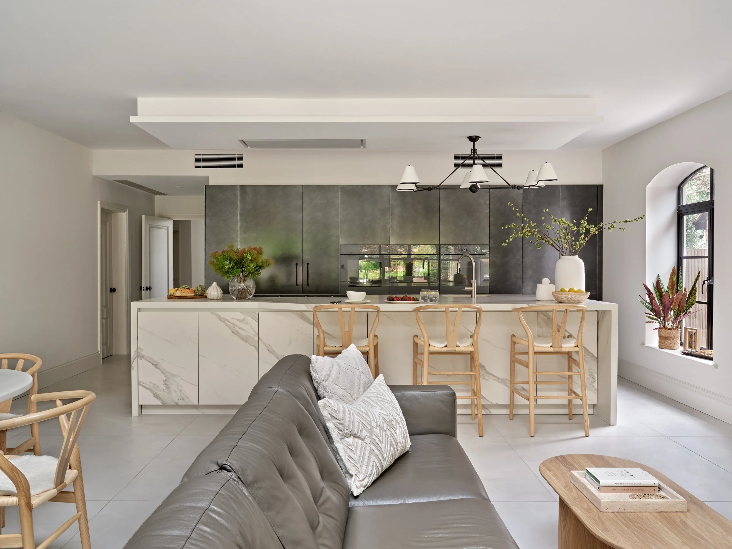 Metallic cabinetry wraps the kitchen, forming a subtle architectural backdrop, while the Dekton-clad island introduces contrast to the space. Pale oak seating and neutral furnishings soften the scheme, creating a balanced and inviting environment across the kitchen, dining and living areas.