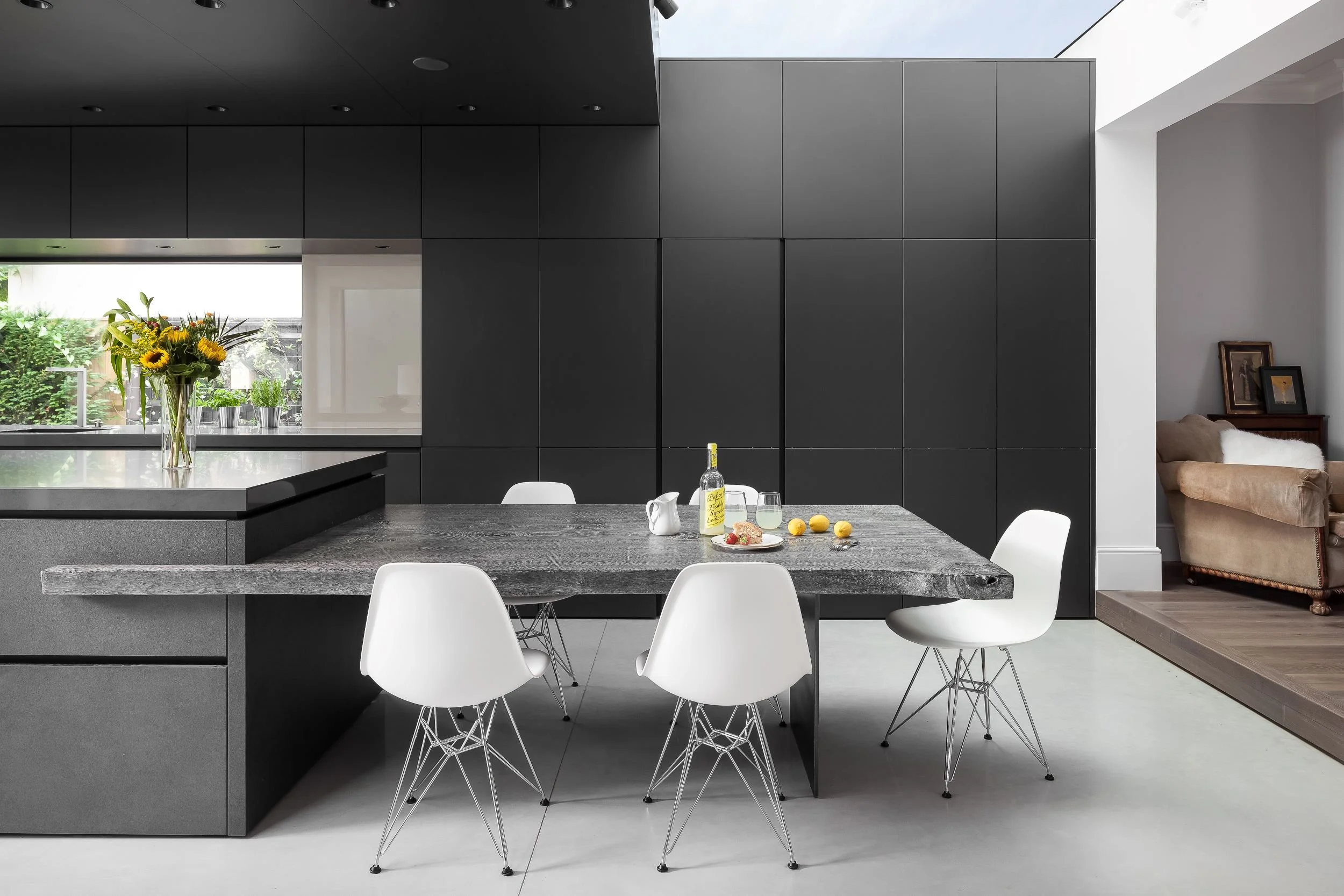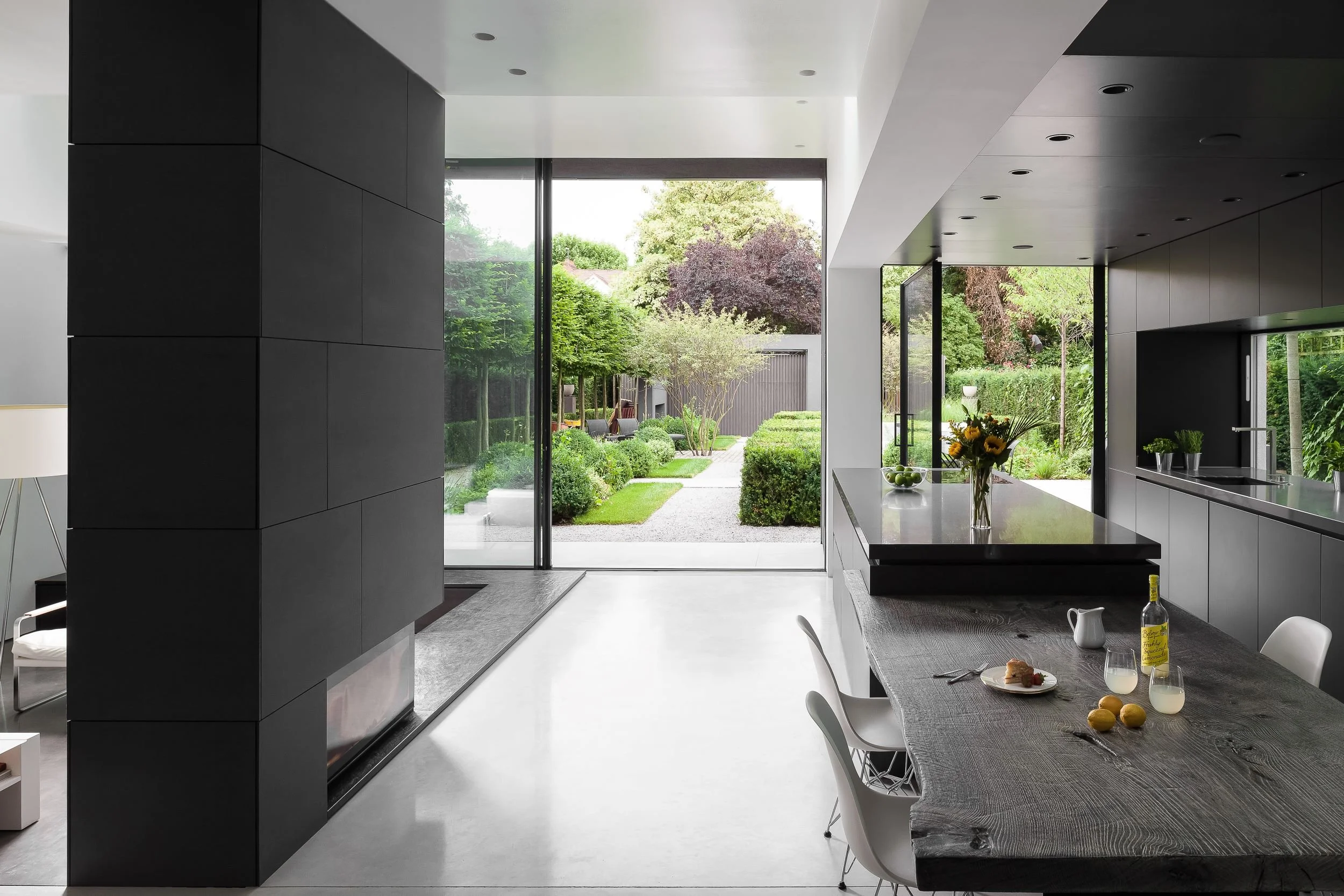 The expansive glazing draws the garden into view, reinforcing the connection between inside and out, while the dark, architectural cabinetry provides a calm, monolithic backdrop.