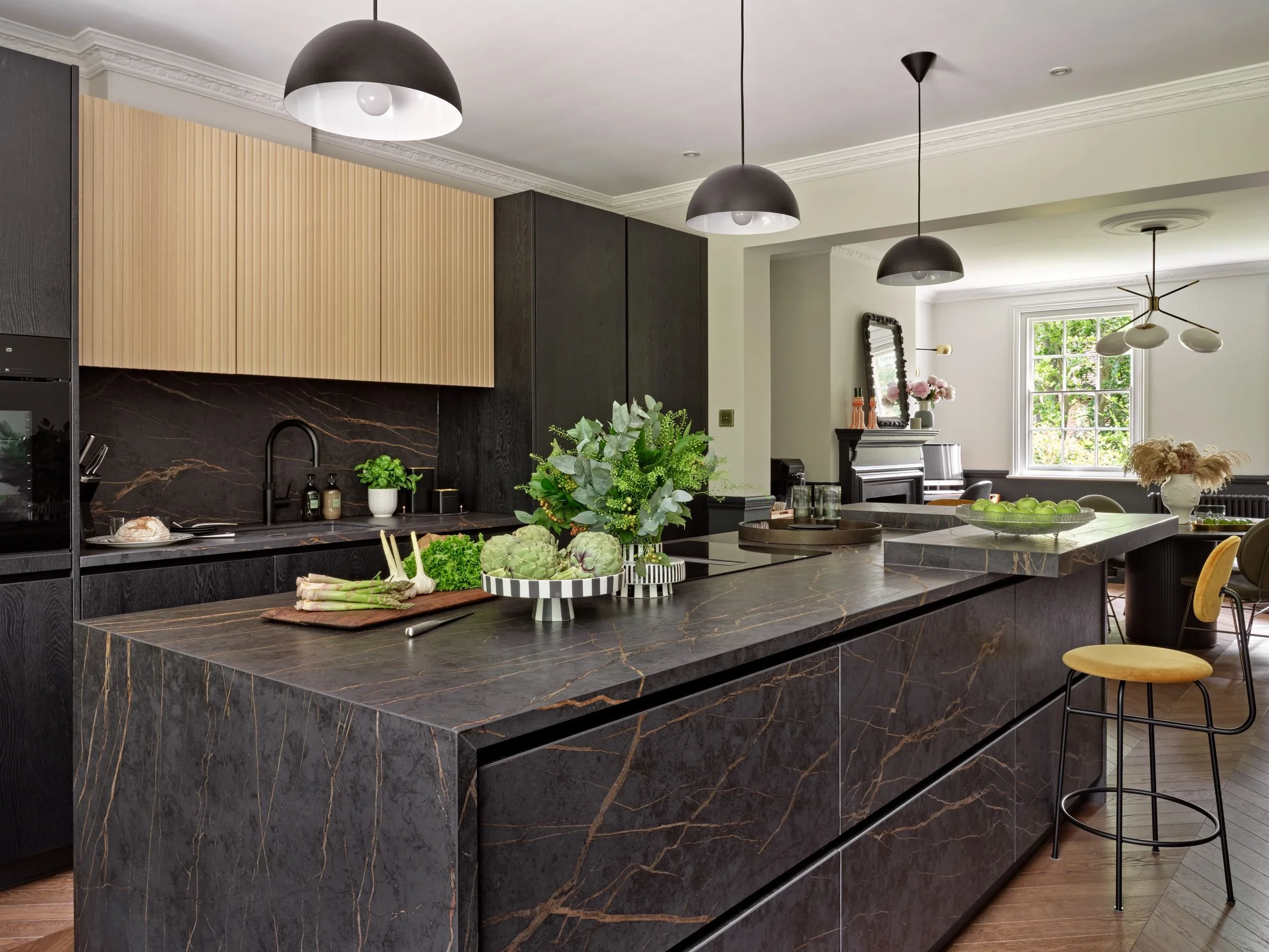 We designed this L-shaped kitchen with a central monolithic stone island to create a striking centrepiece to the room, whilst the darker bank of cabinetry recedes to frame the space. A contrasting timber breakfast bar introduces warmth and tactility, softening the composition of the design.