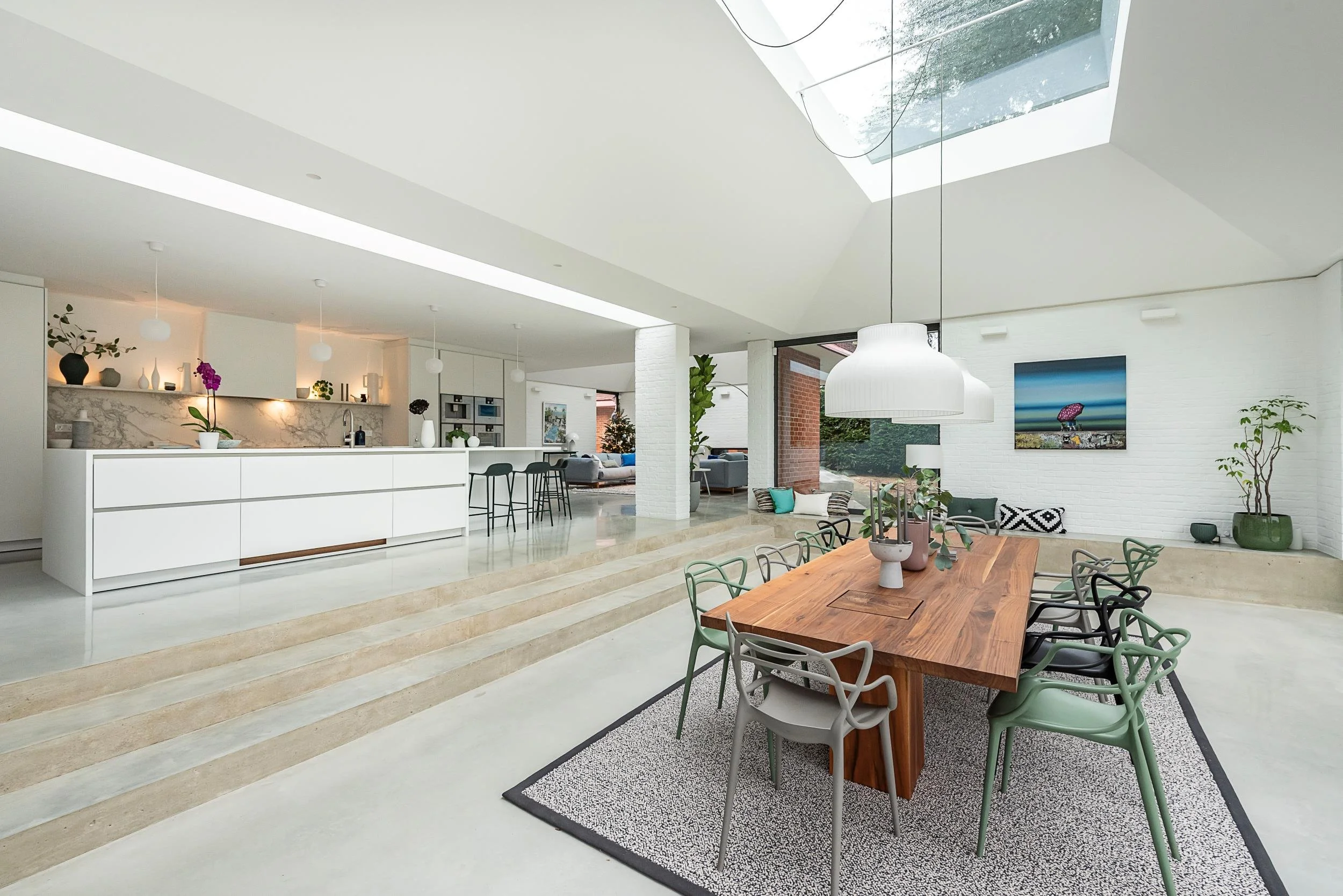 A slight step down defines the dining area, with the long table set beneath the rooflight to draw focus within the wider open plan space.