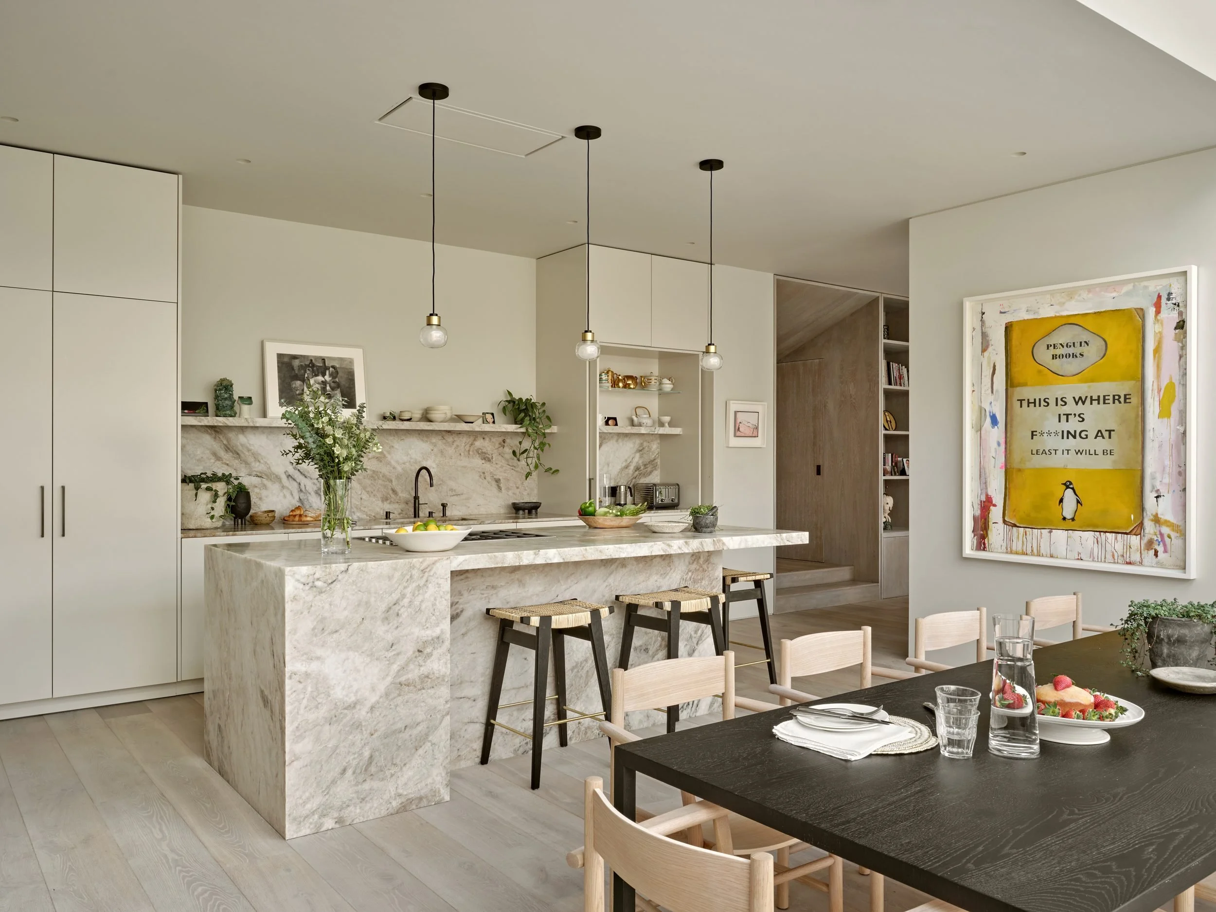 A soft, tonal palette allows the kitchen to sit quietly within the space, with the stone island introducing texture without disrupting the calm.