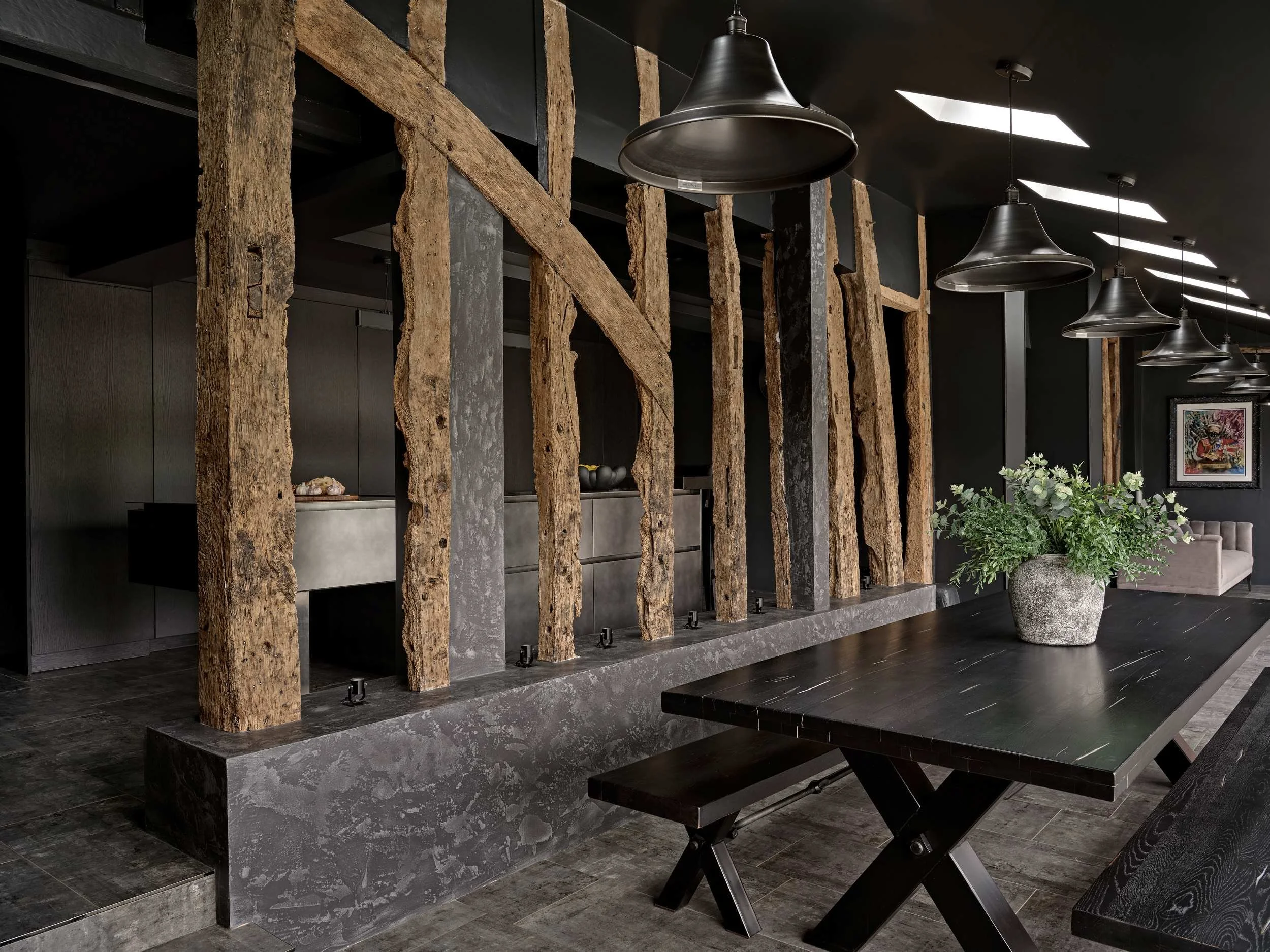In this farmhouse conversion dating back to the 1400s, original beams - constructed from an old ship - bisected the room. Rather than concealing them, the design enhances this unique piece of history.