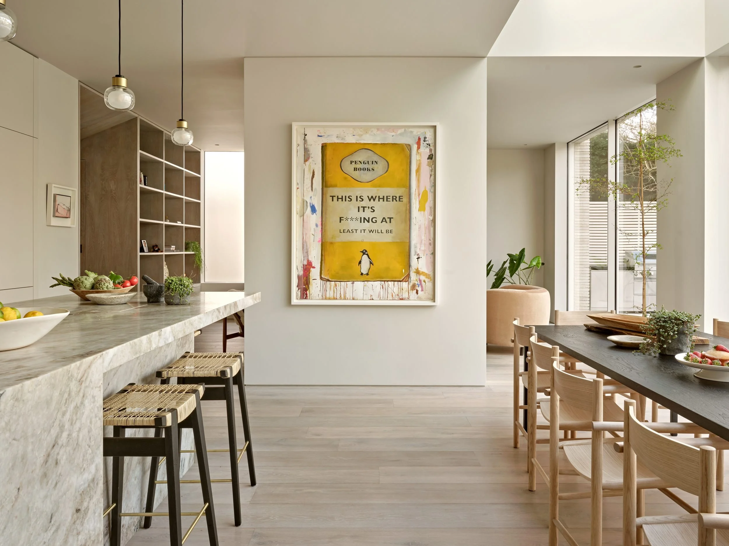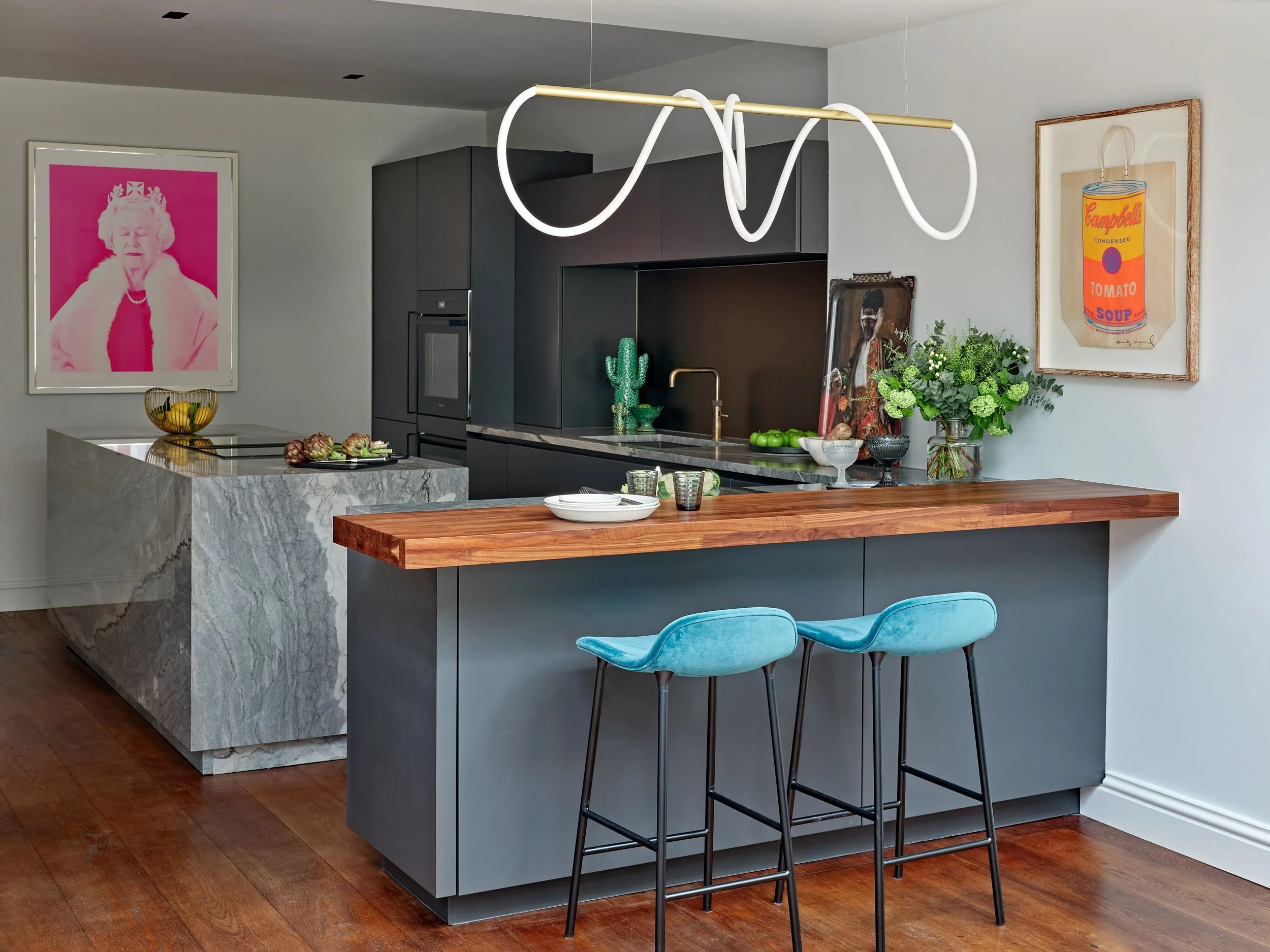 A mix of materials and bold artwork brings a more playful layer to the kitchen, with the timber breakfast bar adding warmth against the darker tones.