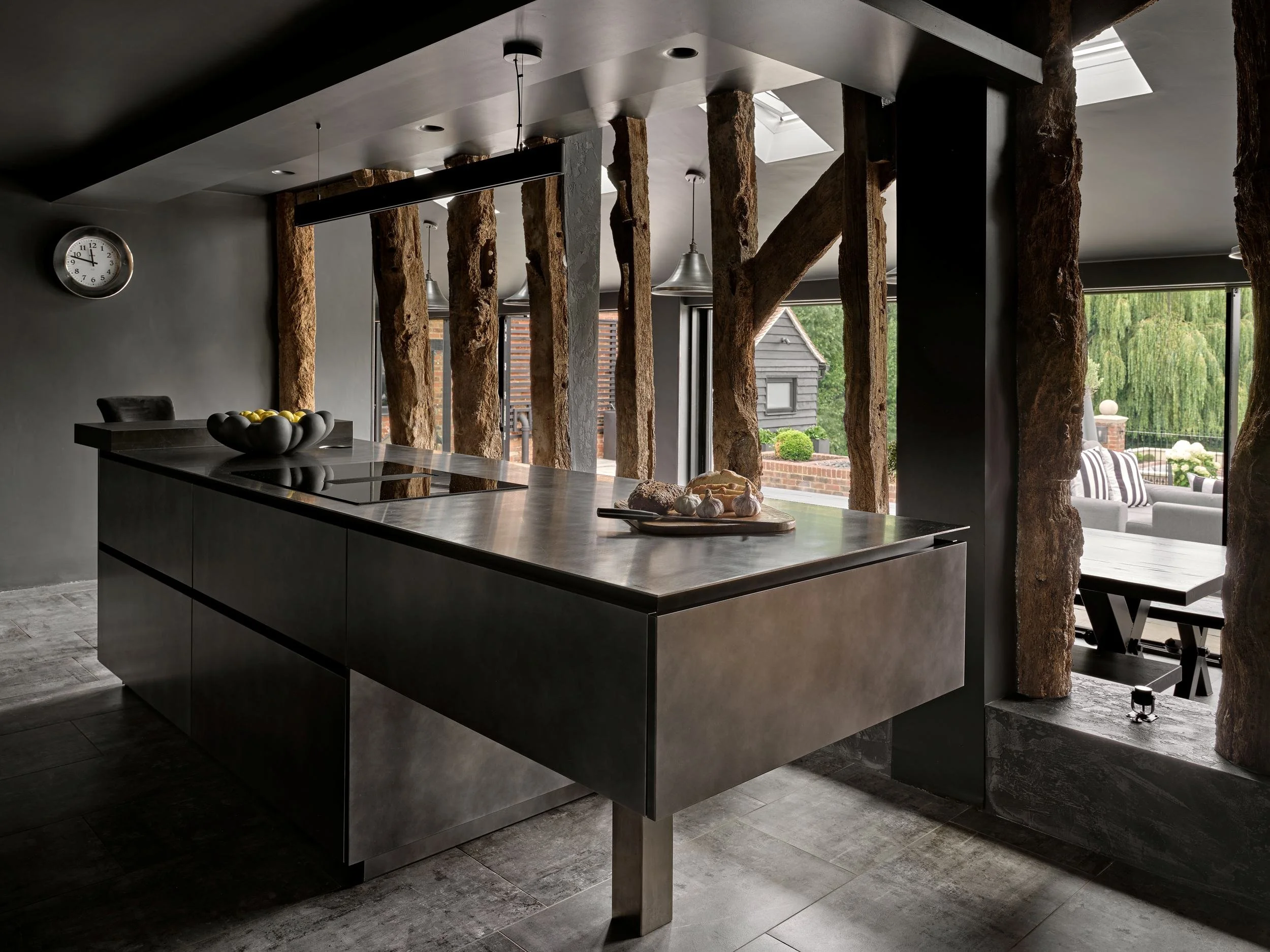 This Z-shaped space demonstrates how unconventional layouts can enhance an open-plan kitchen design. By aligning the interior with an open courtyard, and continuing the same flooring throughout, the design creates the illusion of a larger, more connected space.